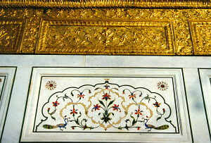 ![]() The exterior white marble wall is inlaid with semi-precious stones to create the designs. |
