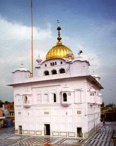 Guru Harkrishan before he died in 1644 had said that his successor could be found at Bakala. When Sikhs flocked there they were confronted with 22 members of the Gurus family each claiming that they were the Guru. Meanwhile a wealthy merchant Makhan Shah had his ships carrying valuable cargo caught in a fierce storm at sea. He vowed to offer five hundred gold coins to the Guru if his goods safely reached home. The ships reached port safely and Makhan Shah made his way to Bakala to pay homage to the Guru. When he finally got there he was confronted with all the same quandary as the rest of the Sikhs, who was the real Guru? Being a businessman Makhan Shah decided that he would pay homage to all of the twenty two claimants and placed two gold coins before each of them as tribute. When he had visited all of the claimants, a child pointed out to him that a holy man lived across the street. Makhan Shah decided that he may as well pay him tribute also. When Makhan Shah entered the house he found that Guru Tegh Bahadur was in meditation. He was told that Tegh Bahadur who had lived here in quiet meditation for many years did not like to receive visitors. Makhan Shah waited until he met the Guru and placed two gold coins before him. At this Guru Tegh Bahadur smiled and said to Makhan Shah, “I thought that you had pledged five hundred coins”. Makhan Shah became so elated that he kissed the Gurus feet and started shouting from the rooftop “I’ve found the Guru, found the Guru!”. All the Sikhs rushed to the house of the quiet saint and when they heard the story there was much rejoicing for many days. Thus the pious, humble saint Tegh Bahadur was acclaimed here as being the true Guru of the Sikhs and natural successor of Guru Harkrishan.