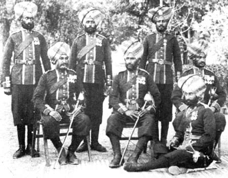 Officers of the 36th Sikh Infantry in full dress including steel chakars on turbans. Photographed 1901, India.