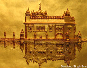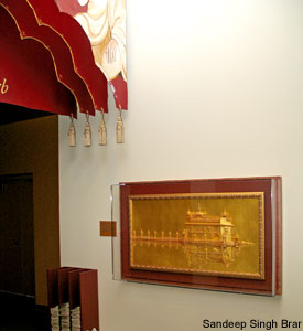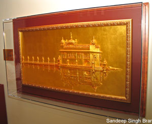 | A gold leaf on fiberglass rendition of Darbar Sahib by artist Kewal Soni greets the visitor at the main entrance. | ||||
